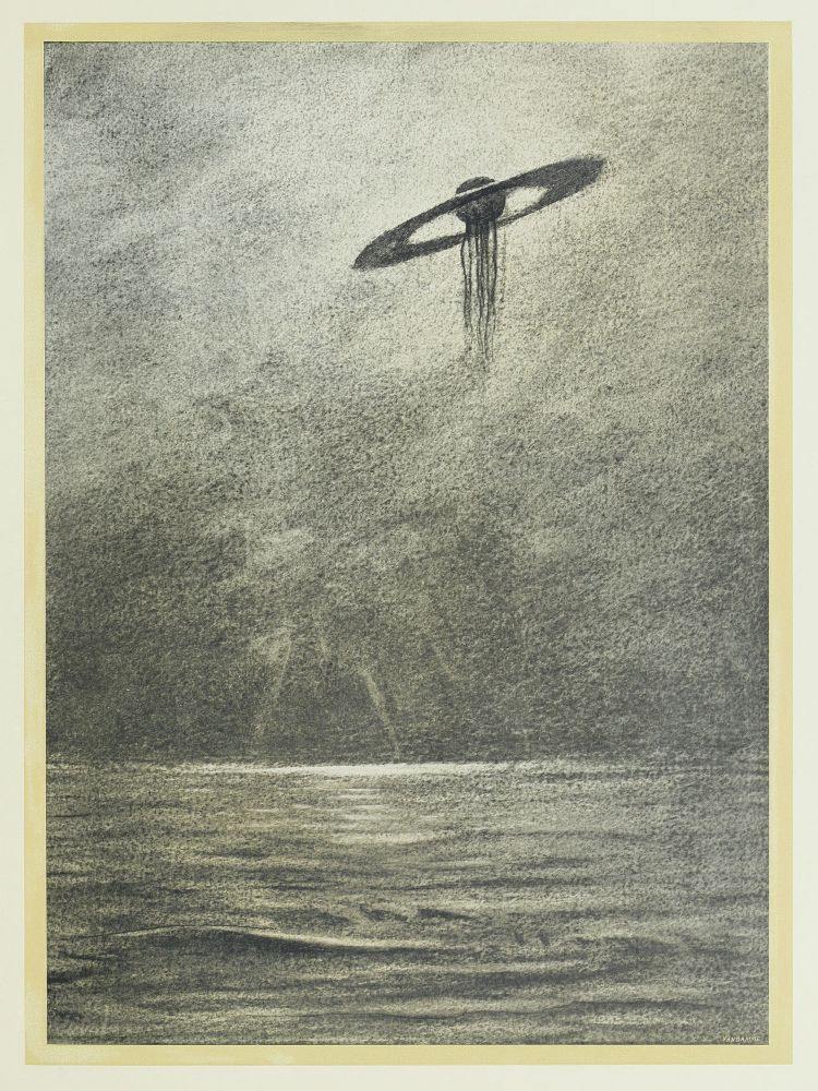 A cette heure-là, j’étais chez moi, écrivant, assis devant mon bureau, et bien que mes fenêtres s’ouvrissent sur Ottershaw et que les jalousies aient été levées—car j’aimais à cette époque regarder le ciel nocturne—je ne vis rien du phénomène. Cependant, la plus étrange de toutes les choses, qui des espaces infinis vinrent sur la terre, dut tomber pendant que j’étais assis là, visible si j’avais seulement levé les yeux au moment où elle passait. Quelques-uns de ceux qui la virent dans son vol rapide rapportèrent qu’elle produisait une sorte de sifflement. Pour moi, je n’en entendis rien. Un grand nombre de gens dans le Berkshire, le Surrey et le Middlesex durent apercevoir son passage et tout au plus pensèrent à quelque météore. Personne ne paraît s’être préoccupé de rechercher, cette nuit-là, la masse tombée.