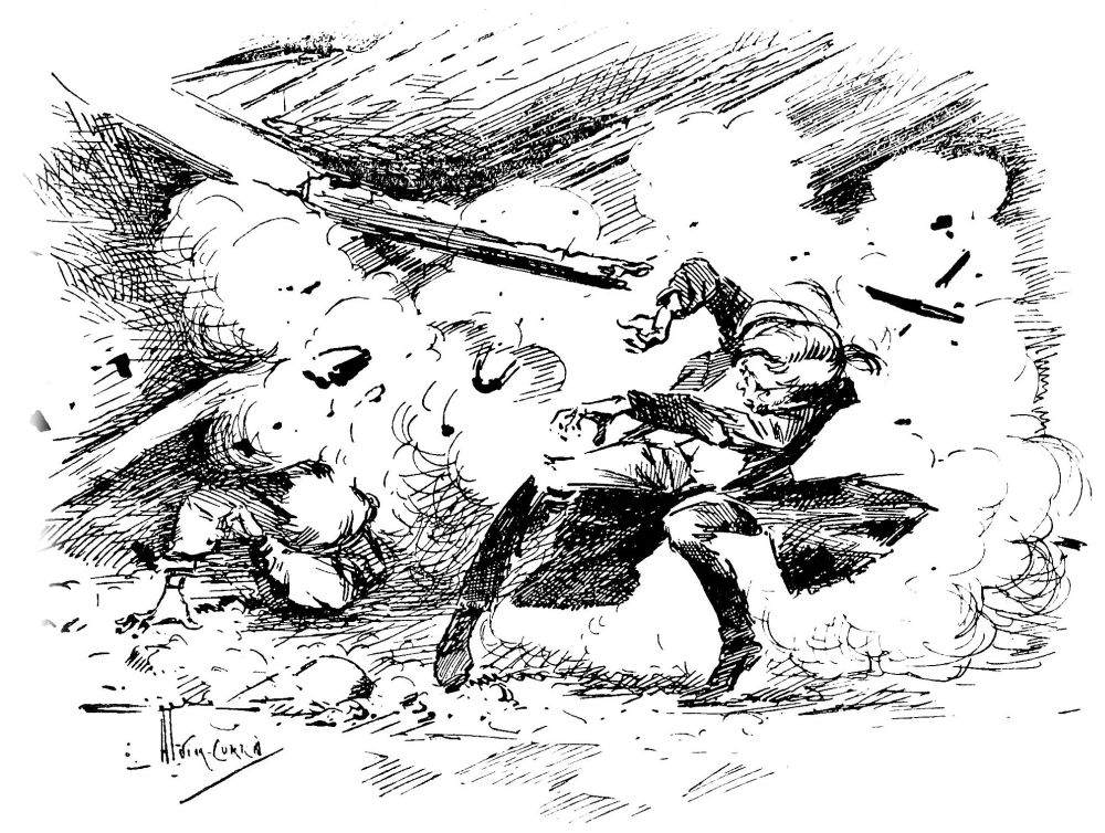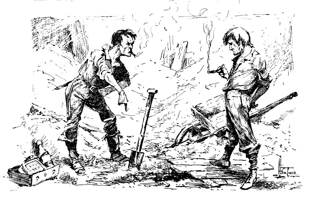 En m’avançant jusqu’au bord du trou, je le trouvai occupé par un groupe d’une demi-douzaine de gens.—Henderson, Ogilvy, et un homme de haute taille et très blond que je sus après être Stent, de l’Observatoire Royal, dirigeant des ouvriers munis de pelles et de pioches. Stent donnait des ordres d’une voix claire et aiguë. Il était debout sur le cylindre qui devait être maintenant considérablement refroidi.{23}