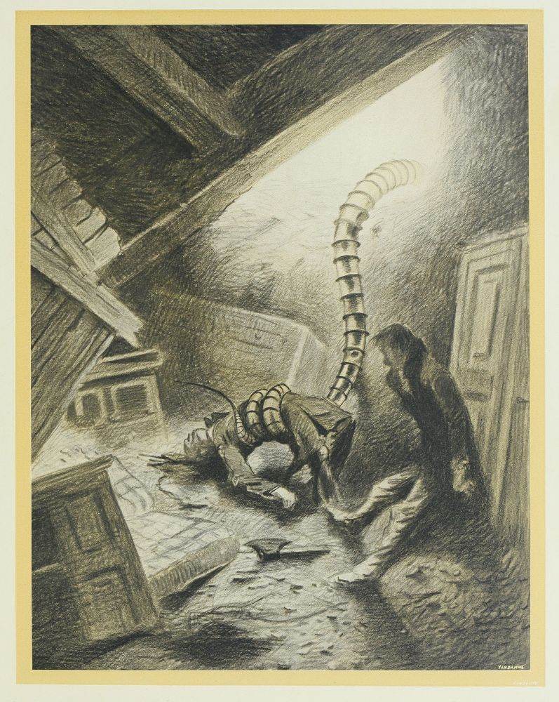 A mi-chemin de la gare de Saint-John’s Wood, je trouvai soudain les restes{213} d’une Machine à Mains. D’abord, je crus qu’une maison s’était écroulée en travers de la route, et ce ne fut qu’en escaladant les ruines que j’aperçus, avec un sursaut, le monstre mécanique, avec ses tentacules rompus, tordus, faussés, gisant au milieu des dégâts qu’il avait faits. L’avant-corps était fracassé, comme si la machine s’était heurtée en aveugle contre la maison et qu’elle eût été écrasée par sa chute. Il me vint alors à l’idée que le mécanisme avait dû échapper au contrôle du Marsien qui l’habitait. Il y aurait eu quelque danger à grimper sur ces ruines pour l’examiner de près, et le crépuscule était déjà si avancé qu’il me fut difficile même de voir le siège de la machine tout barbouillé de sang et les restes cartilagineux du Marsien que les chiens avaient abandonnés.