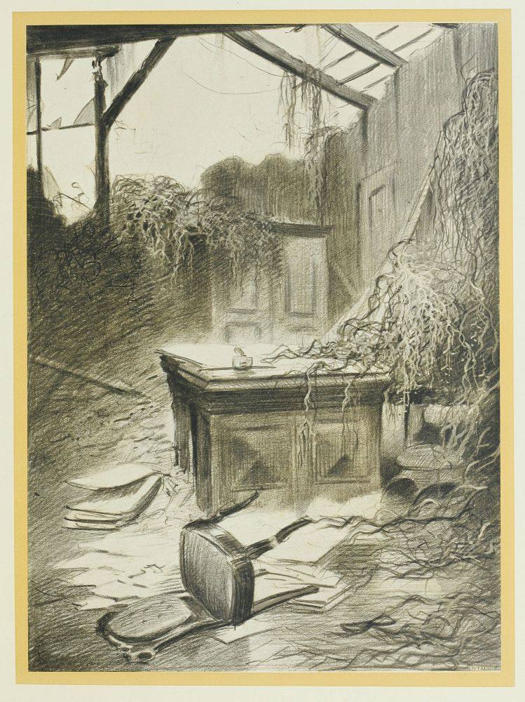 Elle se referma soudain en claquant. Les rideaux de mon cabinet flottaient au courant d’air de la fenêtre ouverte, la fenêtre de laquelle l’artilleur et moi nous avions guetté l’aurore. Depuis lors, personne ne l’avait fermée. Les bouquets d’arbustes écrasés étaient encore tels que je les avais laissés quatre semaines auparavant. Je trébuchai dans le vestibule et la maison sonna le vide. L’escalier était taché et sale à l’endroit où, trempé jusqu’aux os par l’orage, je m’étais laissé tomber, la nuit de la catastrophe. En montant, je trouvai les traces boueuses de nos pas.