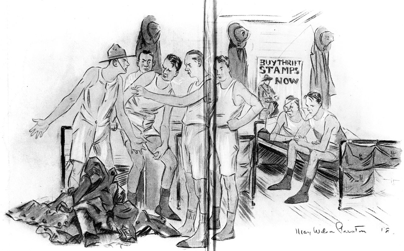 On the last night in camp, at a pine table in a tiny office cut off from the lower squad room, Sergeant Gray made the above record against his own fair name, and sitting back surveyed it grimly. It was two A. M. Across from him the second mess sergeant was dealing in cans and pounds and swearing about a missing cleaver.