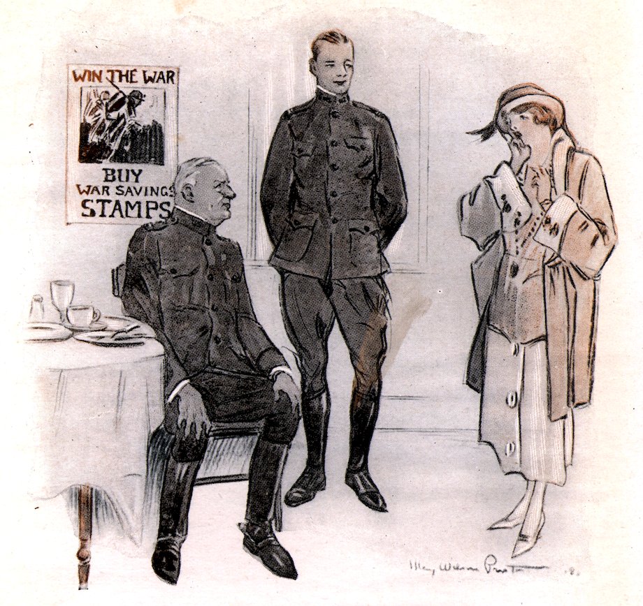 Some time later, at approximately the hour when Sergeant Gray’s twenty-three and a half hours’ leave was up, the little car started for the city. It contained one anxious young lady, one general who rolled constant cigarettes and chuckled, and one aide on the folding seat in the back, rather resentful because there was no adequate place for his legs.