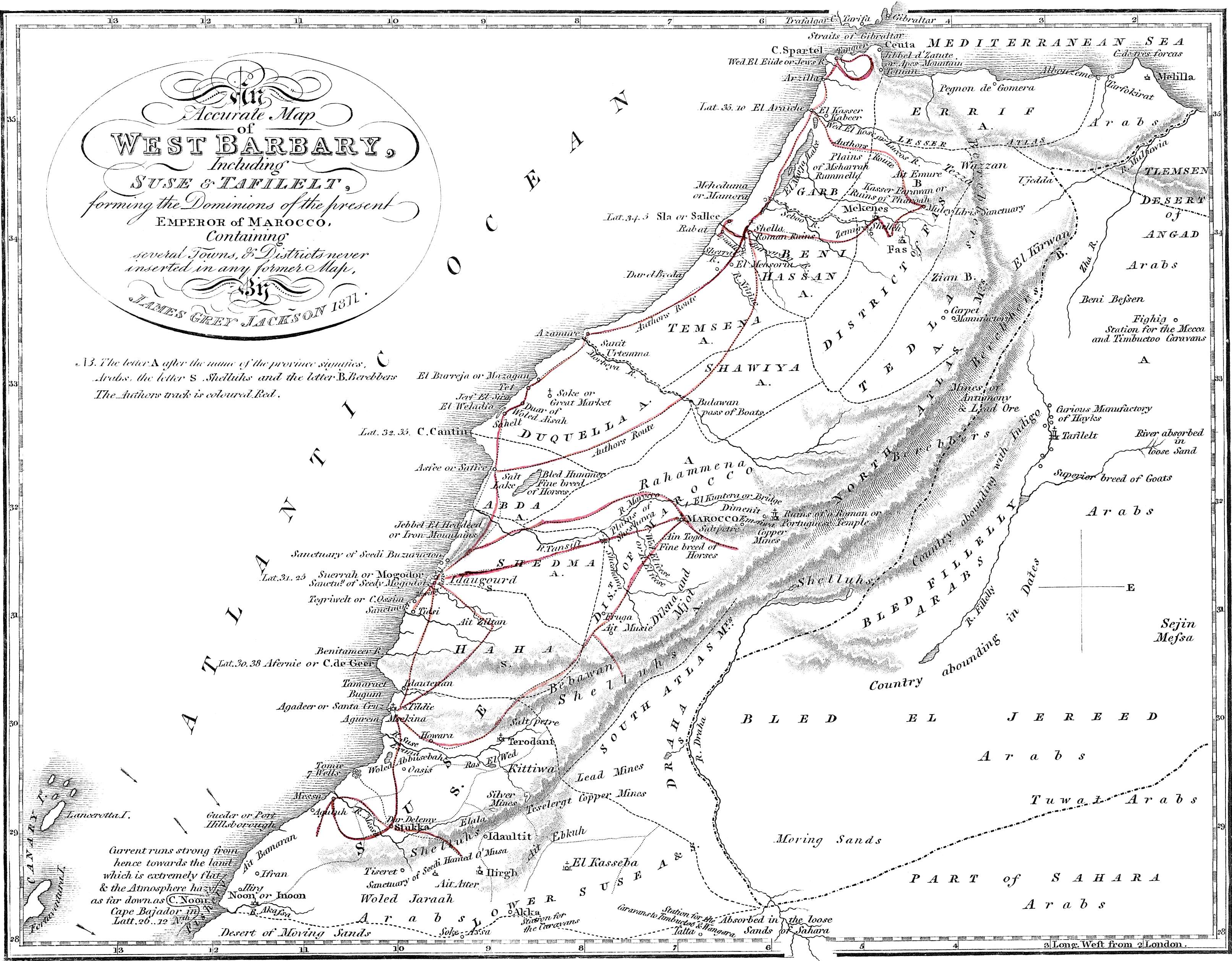 The following sheets have been compiled from various notes and observations made during a residence of sixteen years in different parts of the Empire of Marocco, in the successive reigns of Cidi Mohammed ben Abdallah ben Ismael, Muley Yezzid, Muley el Hesham, and Muley Soliman ben Mohammed; and which were originally intended merely as memoranda for my own use; but shortly after my last arrival in England, I had the honour to converse with a distinguished Nobleman[3] on the subject of African knowledge, and from his Lordship’s suggestions I first determined to submit to the public such information as a long intercourse with the natives of Barbary, as well in a political as a commercial capacity, and a thorough knowledge of the languages of North Africa had enabled me to obtain.