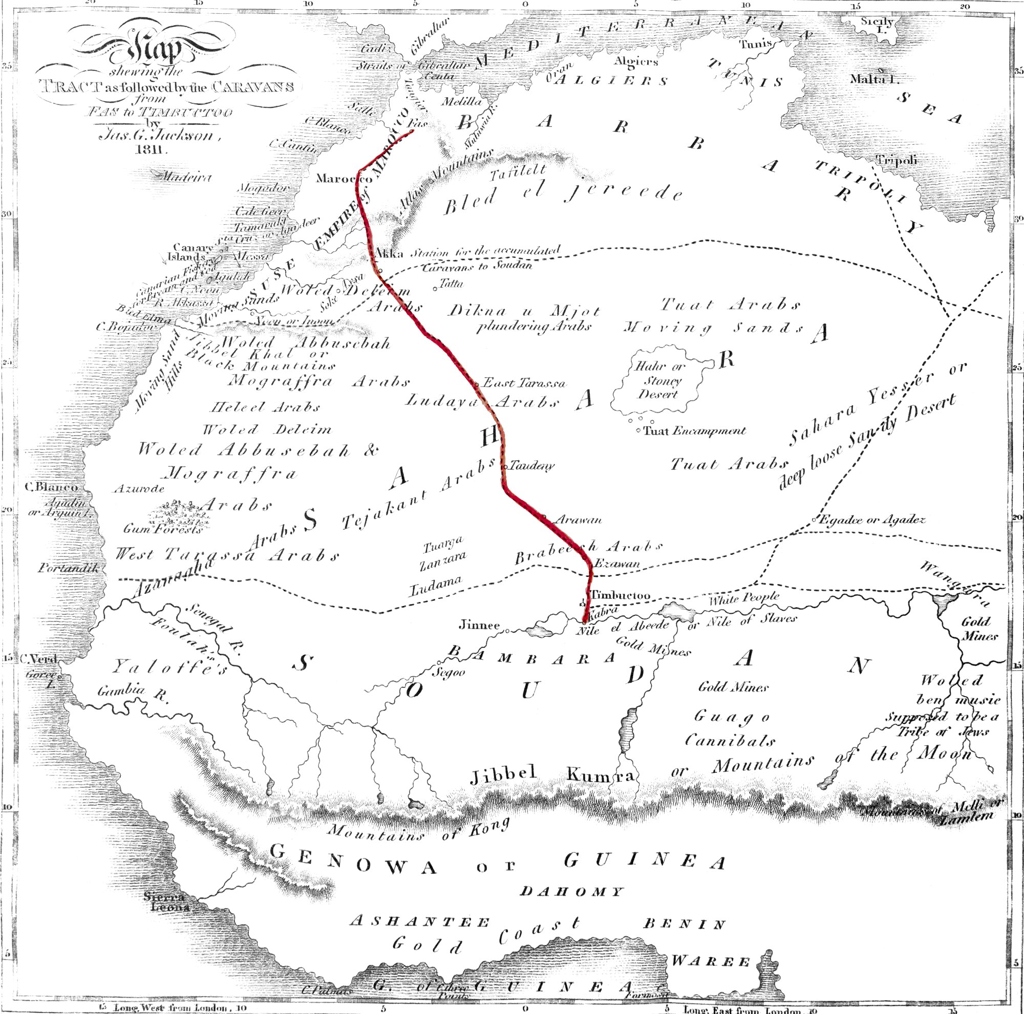 Indeed I have been anxious to discuss every subject that could in[iv] any manner tend to illustrate the actual state of the Empire of Marocco, being confident that the more these subjects are discussed among us, the more they will merit our attention: and that, if ever the interior of Africa is to be explored by Europeans, if ever we are to reach the grand object of our research, the Emporium of Central Africa (Timbuctoo), Marocco is the most eligible point to set out from. But it is indispensably necessary that we should first overcome our own prejudices and misconceptions respecting this country; we should first secure to ourselves all those advantages which would result from an active and uninterrupted commercial intercourse with the principal Sea Ports of the Western Coast; and when these objects shall have been accomplished, the rest will readily follow.